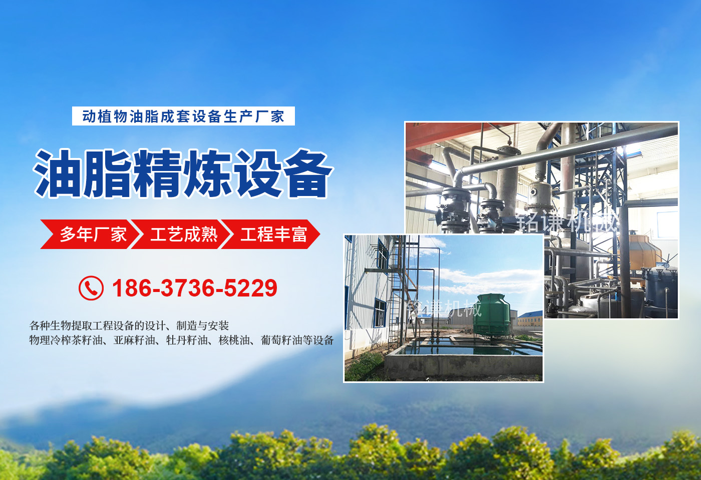 河南省銘謙機械設備有限公司,是集開發、科研、生產、安裝、調試、售后服務為一體的現代化企業。  我公司擁有優良的技術設備,為動物油熬煉設備,無公害化處理設備,核桃油設備,茶籽油設備,牡丹籽油設備,牡丹籽油機械產品的品質提供了有力的技術和質量保證。  ★油料預處理、榨油成套設備的設計、制造與安裝。  ★油料浸出設備的設計、制造與安裝。  ★半連續,連續(化學)物理精煉設備的設計、制造與安裝。  ★茶籽油,牡丹籽油,核桃油,亞麻籽油,葡萄籽油的設備的設計、制造與安裝。  ★各種生物提取工程設備的設計、制造與安裝。  ★各種(豬、牛、羊、雞、鴨等)油廠熬制、精煉設備的設計、制造與安裝。  ★濃香型花生油、菜籽油、茶籽油、亞麻籽油、葵花籽油等設備的設計、制造與安裝。  ★物理冷榨茶籽油、亞麻籽油、牡丹籽油、核桃油、葡萄籽油等設備的設計、制造與安裝。  ★豆類清理設備、雜糧脫皮制粉設備、小麥制粉設備、大米加工流水線、小米加工流水線等設備的設計、制造與安裝。  ★各種過濾設備,化工設備的設計與制造。  我們以工藝和信譽求發展,以質量和設備求生存。堅持“質量為上,用戶為上”的宗旨為客戶提供完善的技術咨詢和售后服務。始終把產品質量作為企業生存、發展的主要要務,竭誠歡迎新老用戶光臨指導。